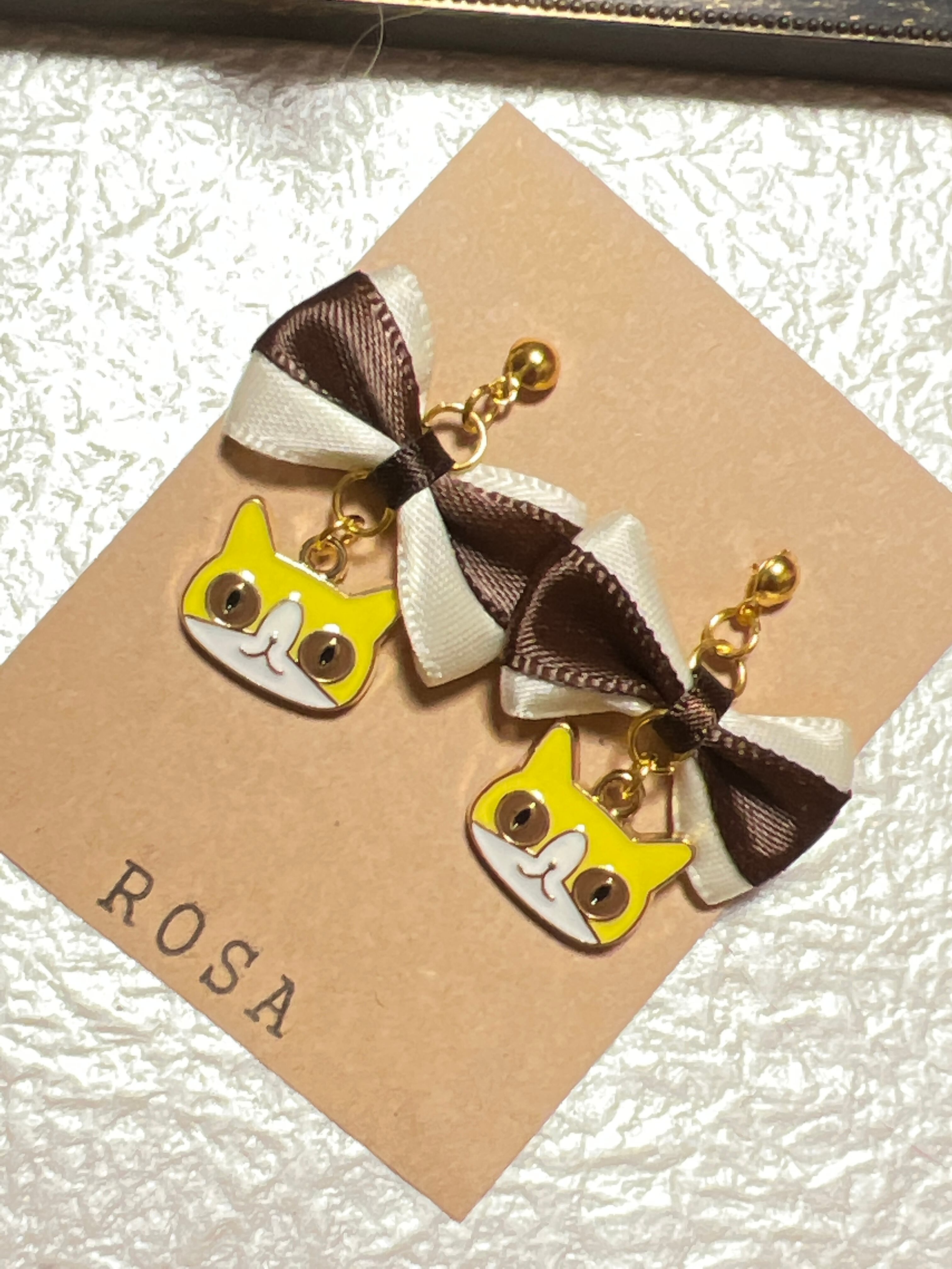 茶色リボン×ハチワレイエロー猫ちゃん ピアス イヤリング